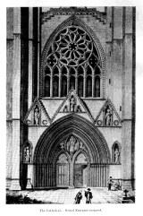 The great west doorway, superbly recessed c.1224-44, has, like Glasgow, a double portal. This doorway is amongst the finest examples in the whole of Britain. The window above is of later date every feature being of Decorated character. It is possible that this large window was inserted by Bishop Columba de Dunbar (1422-35), either because of damage to what had previously existed or merely to reflect the current vogue of the times.